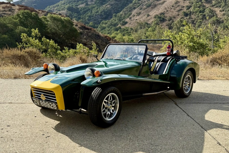 This 1973 Lotus Super Seven is a right-hand-drive Series 4 example that was sold new in the UK. It was fitted with a “Big Valve” 1. 6L twin-cam inline-four and a replacement fiberglass tub in addition to undergoing chassis repairs in the early 1980s before being brought to the US in the mid-2010s. Chassis S43314S subsequently underwent additional refurbishment work that involved a color change to green, an engine rebuild, and more as detailed below. The car rides on 13″ Jupiter alloy wheels coupled with Gaz adjustable coilovers at all four corners and is equipped with front disc brakes. The cockpit houses fixed-back bucket seats trimmed in black vinyl that are paired with Sabelt harnesses. The engine breathes through dual Weber 45 DCOE carburetors as well as a stainless-steel exhaust system, while shifting is through a four-speed manual transmission. Further details include a black canvas soft top, a roll bar, a heater, and retrofitted Smiths instrumentation. Acquired by the current owner in 2016, this Super Seven is now offered on dealer consignment with a collection of records and a clean California title.